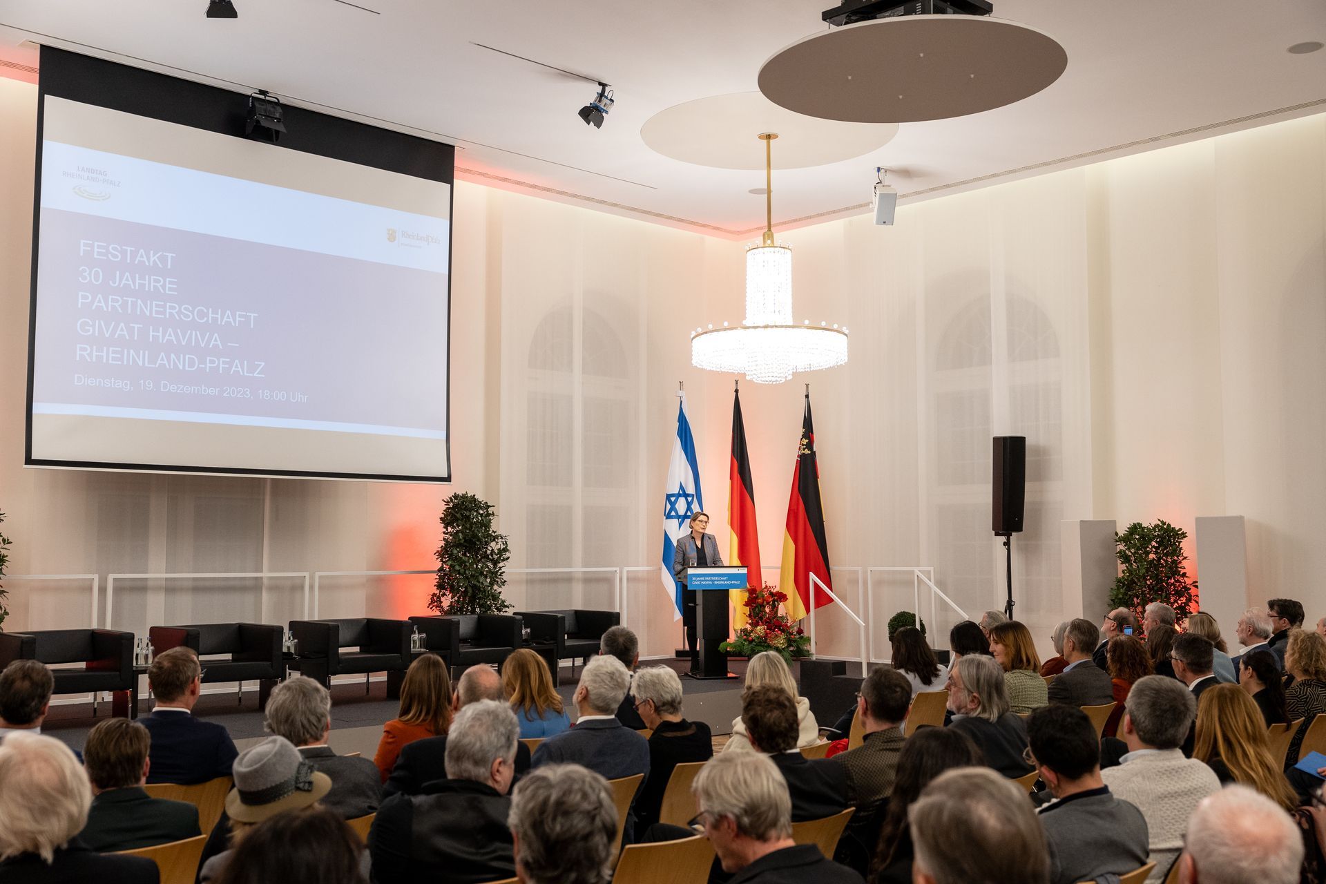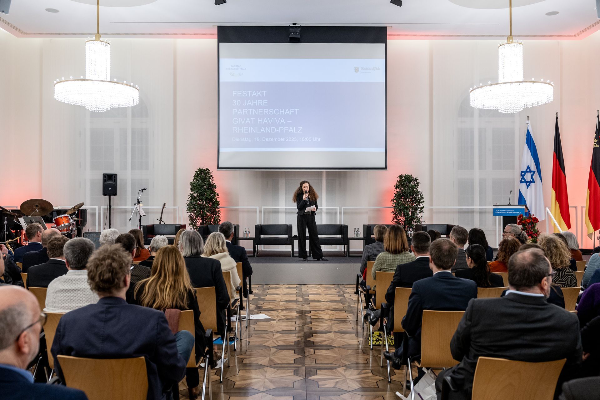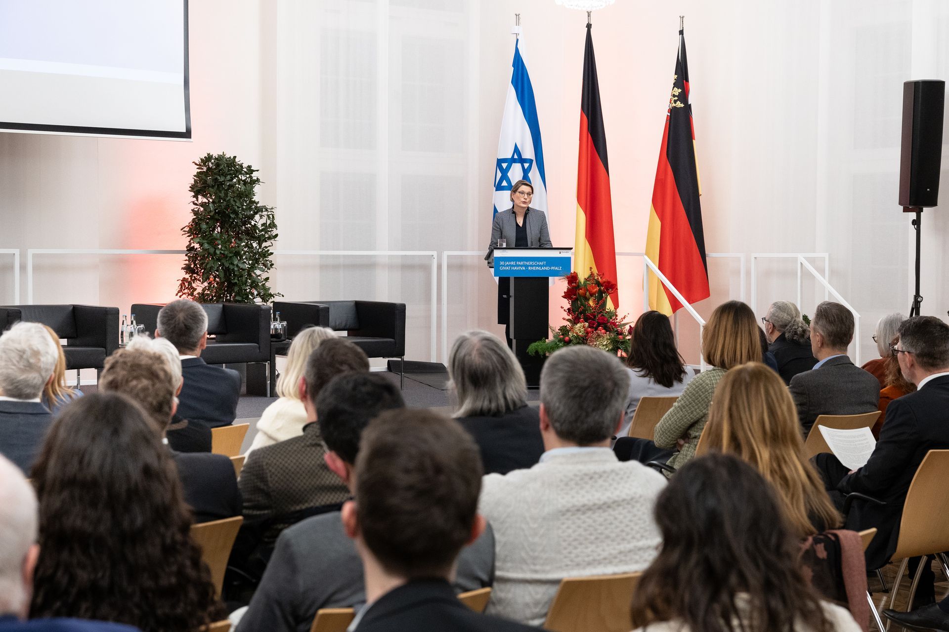 Moderatorin Shelly Kupferberg freute sich über die Anwesenheit zahlreicher Mitglieder von Landtag und Landesregierung - darunter Bildungsministerin Stefanie Hubig - und des Präsidenten des Landesverfassungsgerichtes Lars Brocker. Unter den Gästen war Ministerpräsident a.d. Kurt Beck, der sich von Anfang an stark gemacht hat für eine kontinuierliche Unterstützung einer Friedenslösung in Israel und der Partnerschaft, und eine Reihe Gründungsmitgliedern des Freundeskreises Givat Haviva Deutschland e.V.