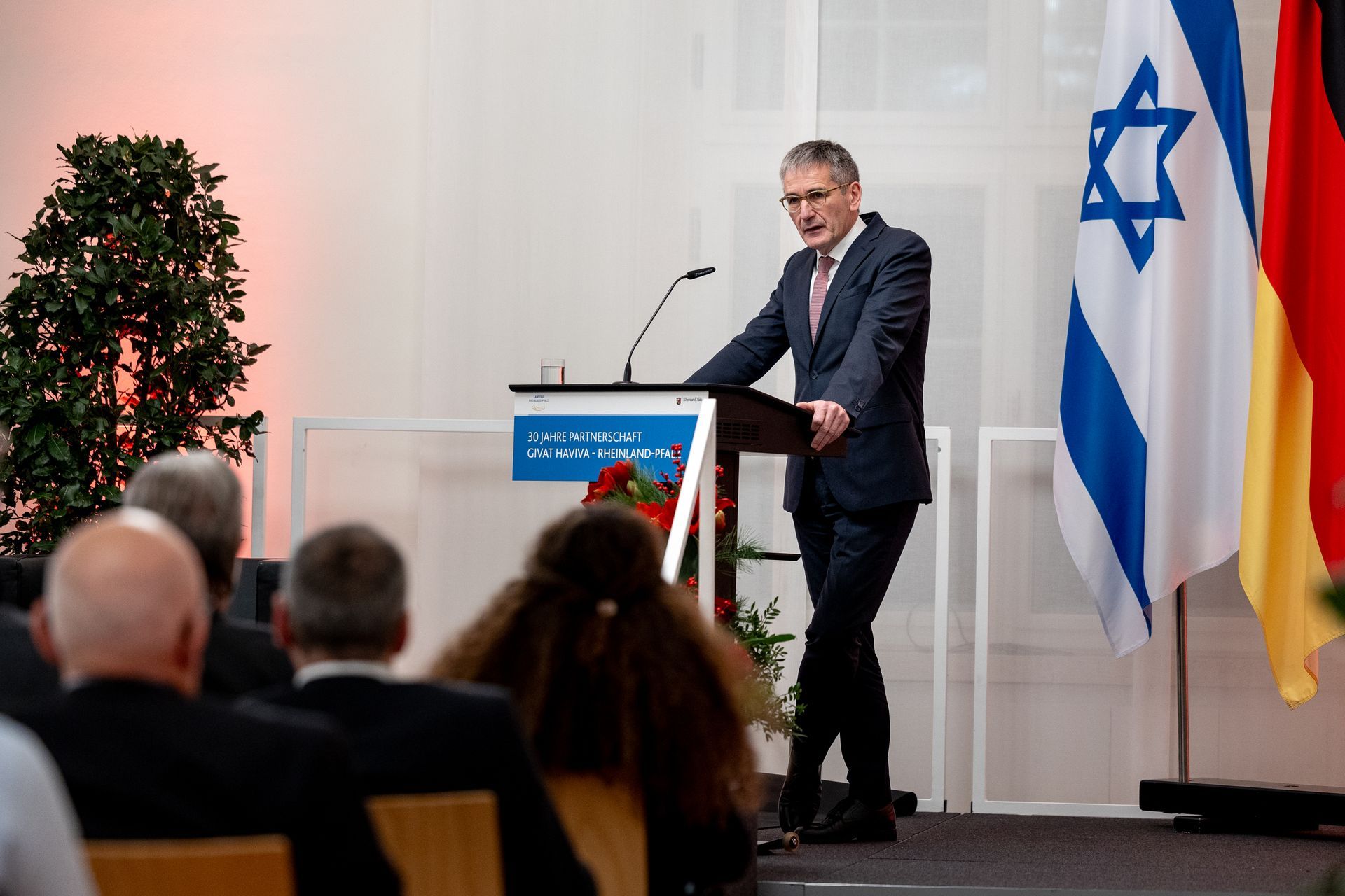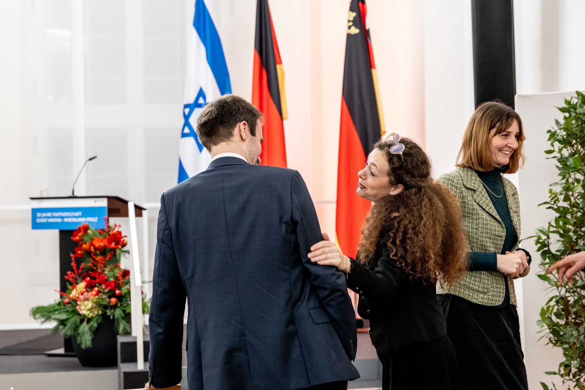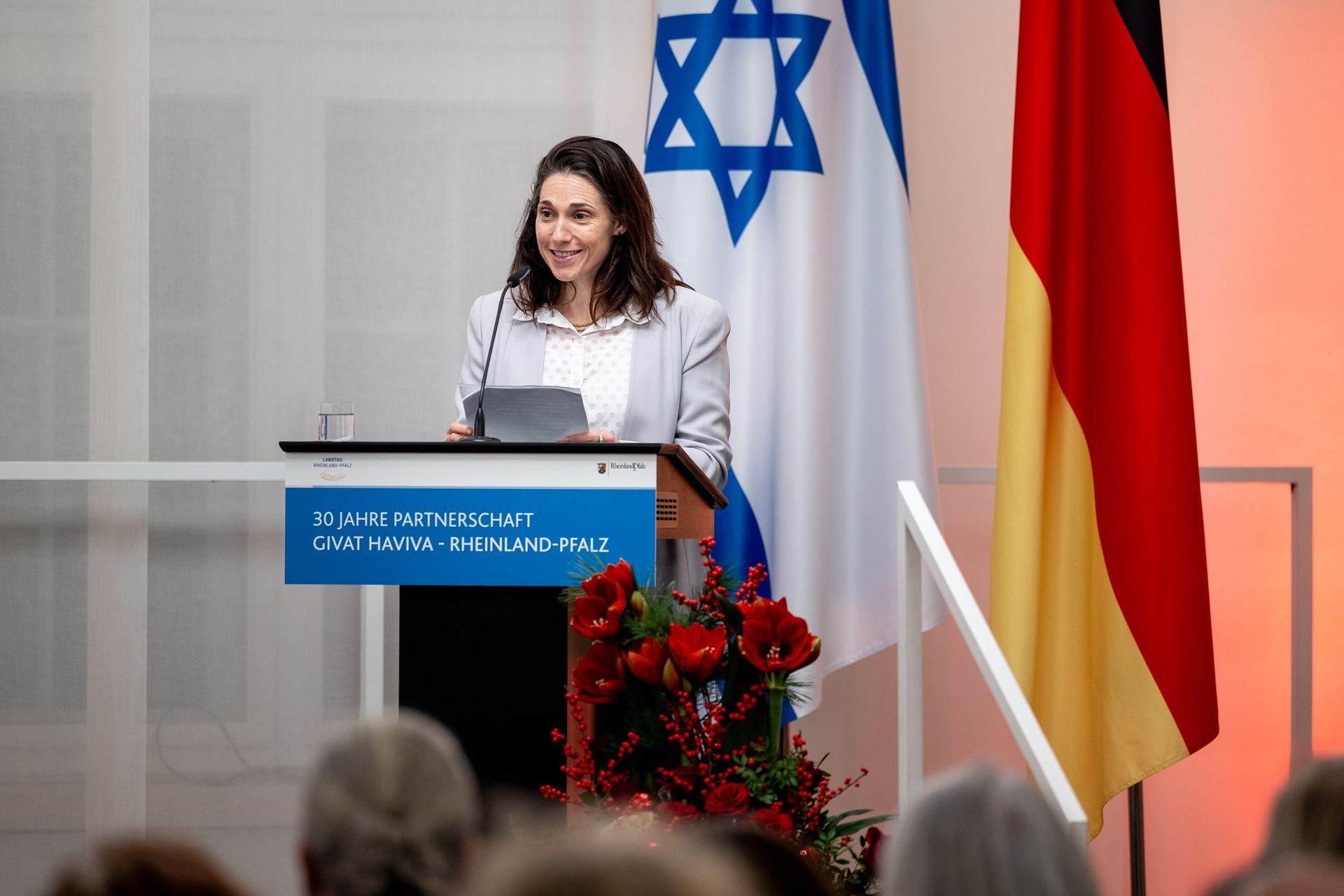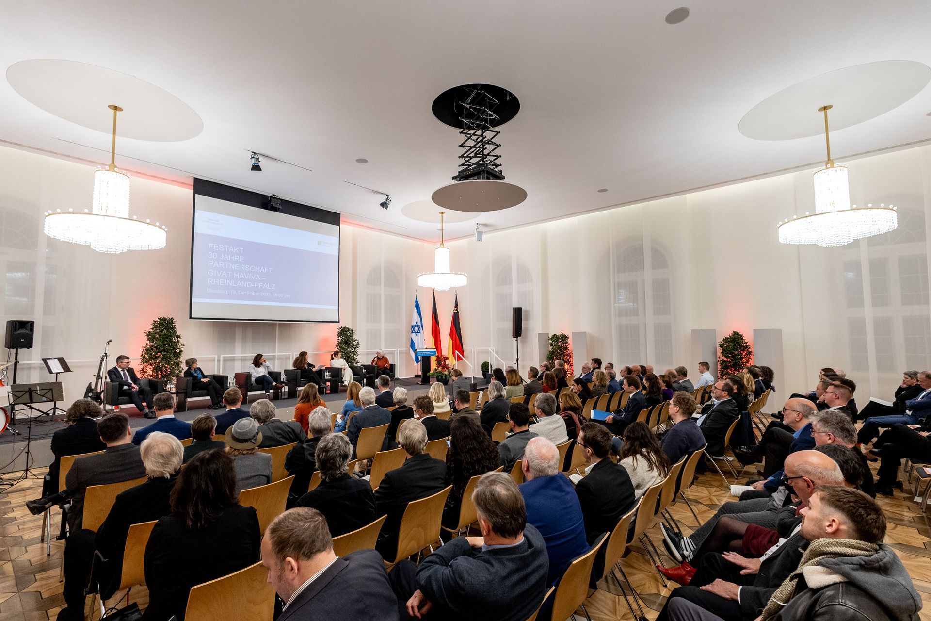 Moderatorin Shelly Kupferberg freute sich über die Anwesenheit zahlreicher Mitglieder von Landtag und Landesregierung - darunter Bildungsministerin Stefanie Hubig - und des Präsidenten des Landesverfassungsgerichtes Lars Brocker. Unter den Gästen war Ministerpräsident a.d. Kurt Beck, der sich von Anfang an stark gemacht hat für eine kontinuierliche Unterstützung einer Friedenslösung in Israel und der Partnerschaft, und eine Reihe Gründungsmitgliedern des Freundeskreises Givat Haviva Deutschland e.V.